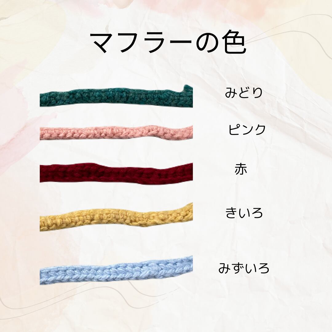 ①マフラーの色選択: みどり、ピンク、赤、黄色、みずいろ、赤緑(クリスマスカラー)